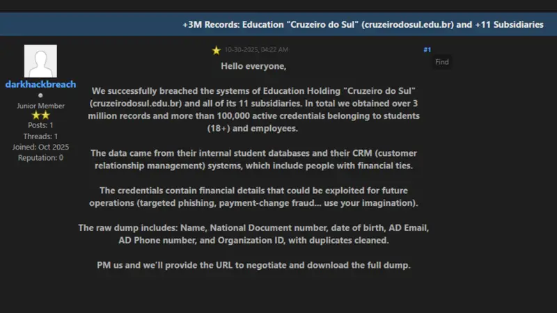 No último dia 30 de outubro, cibercriminosos anunciaram a venda de supostos dados da holding educacional Cruzeiro do Sul. Segundo a publicação, o material obtido totalizaria mais de três milhões de registros, incluindo 100 mil credenciais ativas de alunos e funcionários. O vazamento teria afetado 11 instituições subsidiárias do grupo, que confirmou a possibilidade de invasão e início das investigações ao portal TecMundo.
